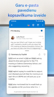 Atklājiet efektīvu veidu, kā pārvaldīt savu digitālo dzīvi ar Outlook darbam ar Android. Mēs esam izstrādājuši šo lietotni, lai jūsu svarīgākā informācija vienmēr būtu viegli sasniedzama. Pateicoties inteliģentajai fokusa iesūtnei, jūs vairs nepalaidīsit garām būtisko, jo vissvarīgākie ziņojumi automātiski tiek izcelti priekšplānā. Iztēlojieties, cik vienkārši ir pārslēgties no e-pasta uz kalendāru, lai ātri ieplānotu tikšanos vai informētu kolēģus par savu pieejamību, vai arī acumirklī pievienot dokumentu no jūsu failu saraksta jebkuram ziņojumam. Outlook darbam ar Android padara jūsu ikdienas saziņu un organizēšanu neticami gludu.