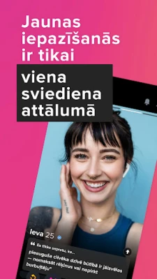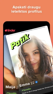 Daudzi mūs dēvē par pasaulē populārāko iepazīšanās lietotni, un mēs esam šeit, lai palīdzētu tev veidot jaunus savienojumus. Ar Tinder iepazīšanās ir gan vienkārša, gan aizraujoša. Savu profilu vari padarīt spilgtu, augšupielādējot labākās fotogrāfijas un daloties ar to, kas tevi raksturo. Kad ieraugi kādu, kurš piesaista uzmanību, vienkārši "velc pa labi". Ja kāds neuzrunā, "velc pa kreisi", lai pārietu tālāk. Maģija sākas, kad simpātijas ir abpusējas – tikai tad veidojas saderība. Šī abpusējās piekrišanas sistēma nodrošina, ka sarunas sākas ar patiesu interesi no abām pusēm. Mūsu moto ir nemainīgs: Veido saderības. Čato. Tiecies. Tas ir tavs ceļš uz jaunām attiecībām un pieredzēm.
