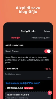 Tinder piedāvā arī uzlabotas funkcijas, kas paplašina iepazīšanās pieredzi. Ar Tinder Plus® tu iegūsti neierobežotu "Patīk" skaitu, iespēju "attīt" pēdējo izvēli un "Pases" funkciju, lai satiktu cilvēkus visā pasaulē. Tinder Gold™ paver durvis uz vēl ekskluzīvākām iespējām, piemēram, "Pielūdzēju sarakstu", kas parāda, kam tu patīc, tādējādi ietaupot tavu laiku. Tu saņem arī ikmēneša "Boost", lai palielinātu sava profila redzamību, un iknedēļas "Ļoti patīk" vērtējumus īpašiem profiliem. Un tiem, kas vēlas maksimāli izmantot Tinder sniegtās priekšrocības, Tinder Platinum™ piedāvā prioritārus "Patīk" vērtējumus un unikālu iespēju nosūtīt ziņu pirms saderības izveidošanas, kā arī citas priekšrocības. Neatkarīgi no tā, vai tu meklē jaunus draugus, aizraujošus randiņus vai savu liktenīgo partneri, Tinder ir vieta, kur tu vari atrast meklēto. Pievienojies miljoniem cilvēku un sāc savu stāstu jau šodien!